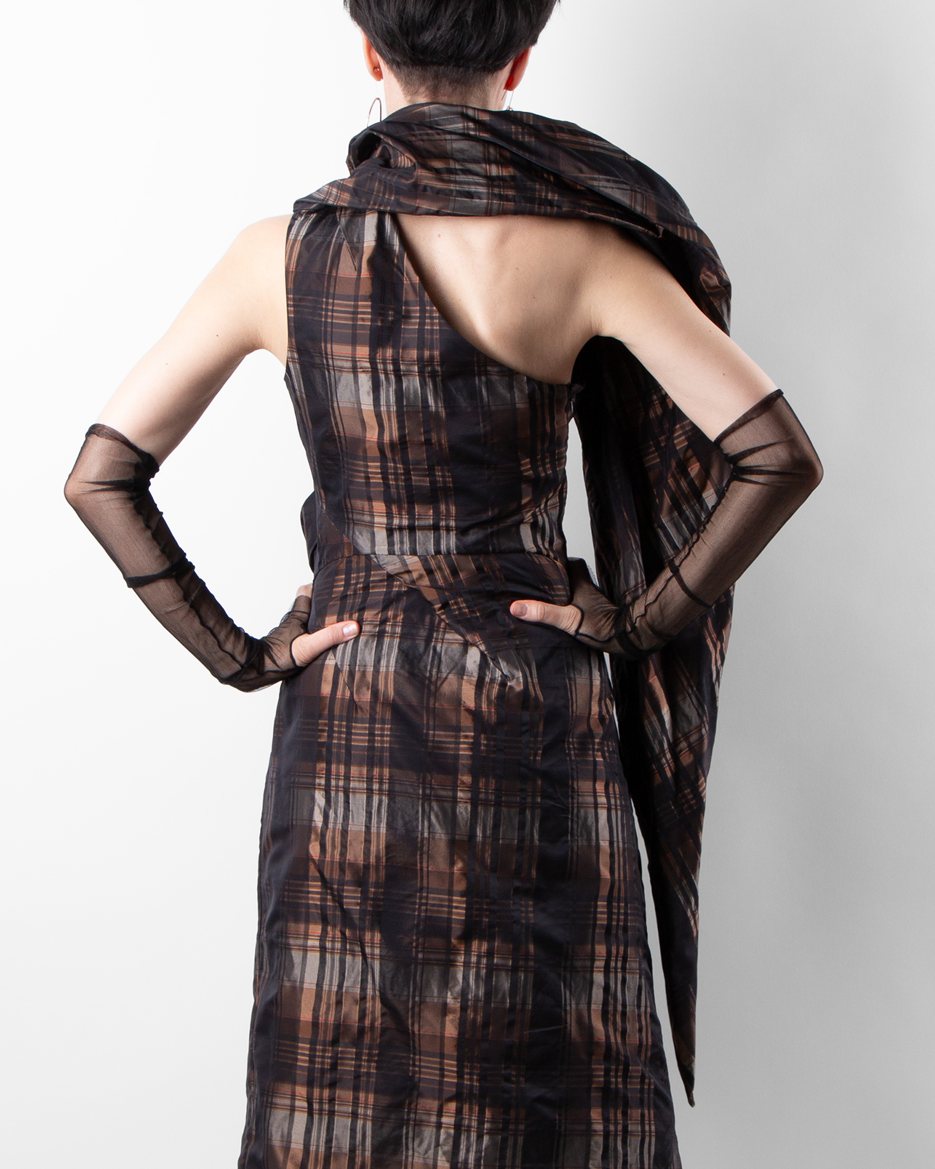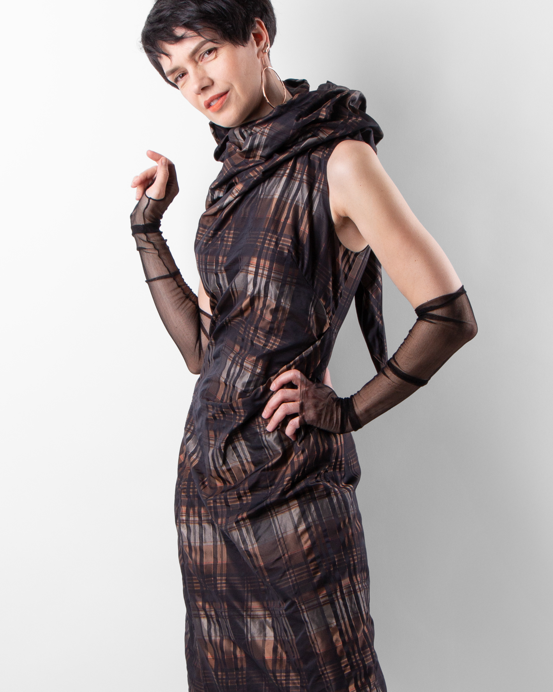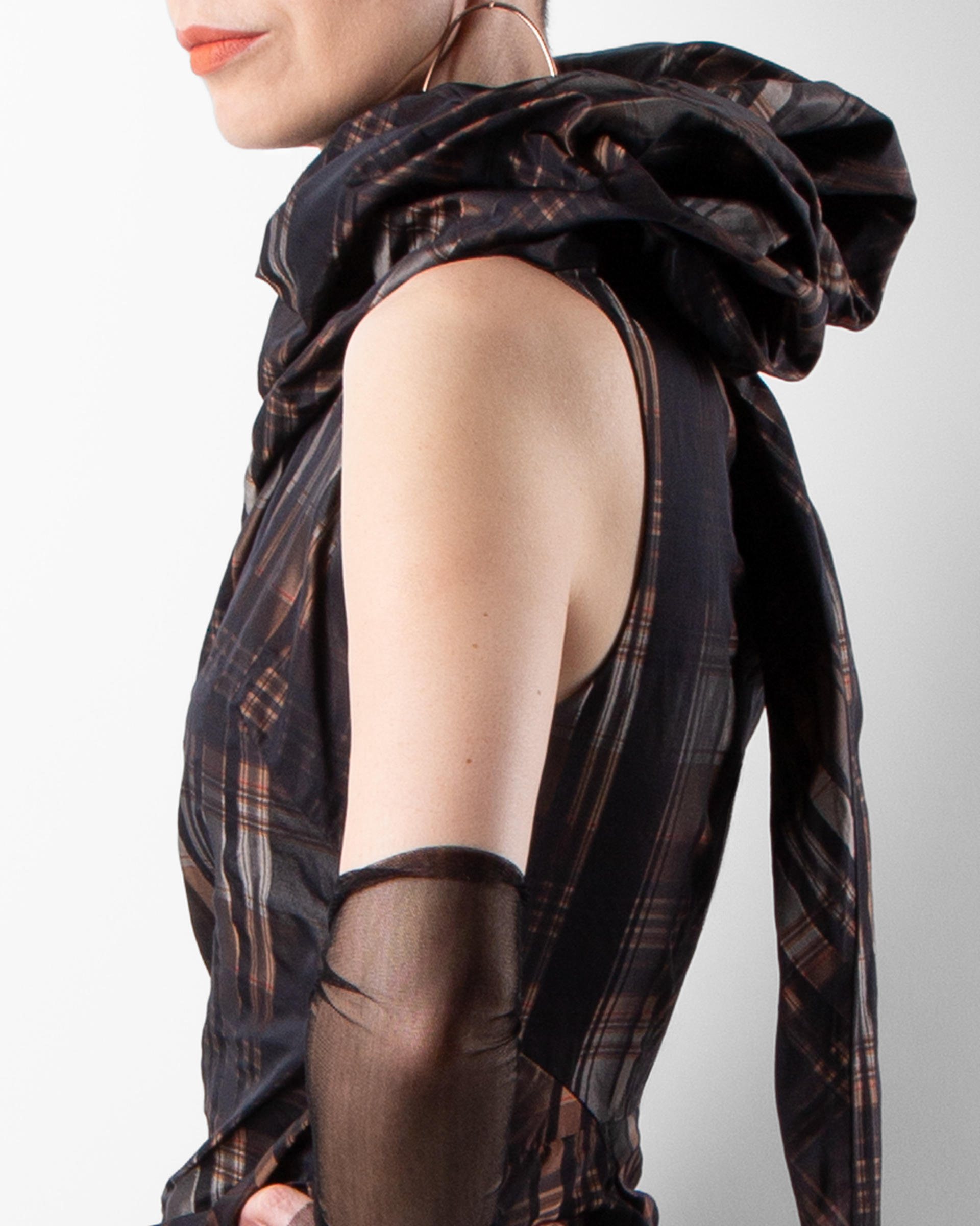 ZARA silk sheer arm gloves, COS earrings.